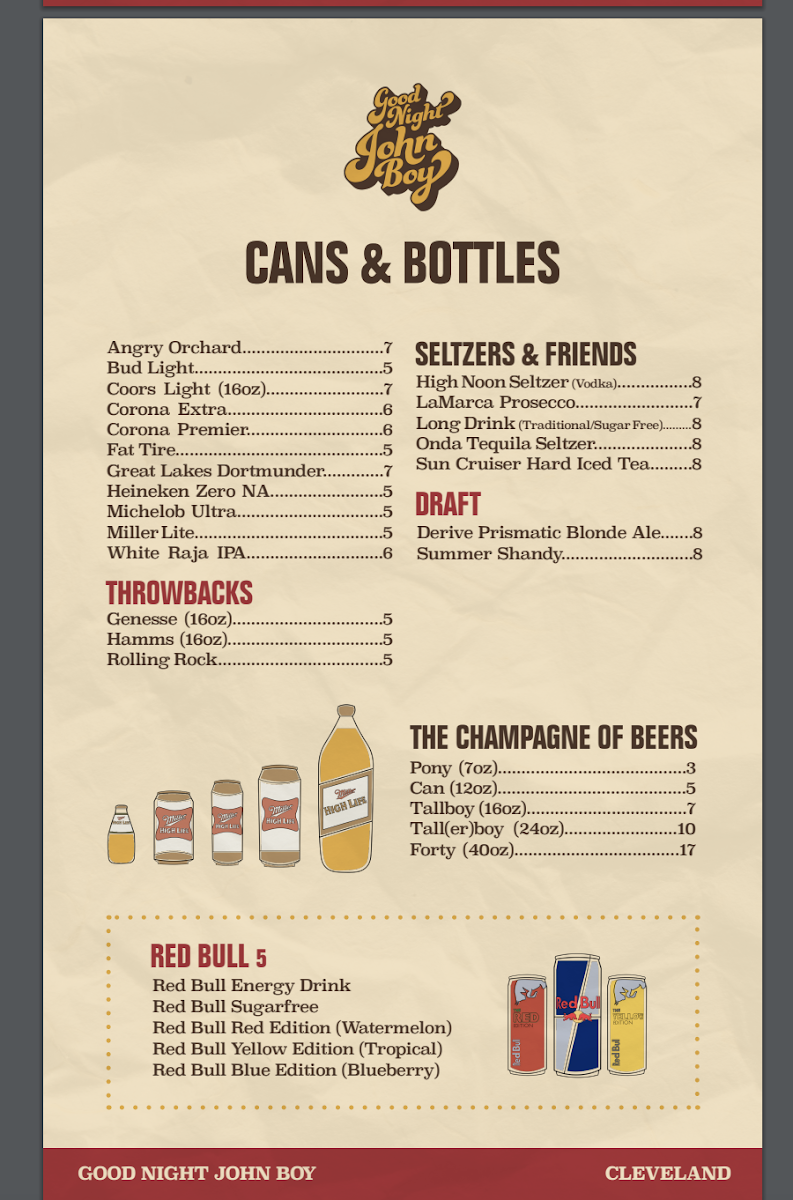 Welcome to Good Night John Boy, where retro vibes meet modern fun! Nestled in Cleveland, this vibrant venue is a hotspot for those looking to unwind and dance the night away. The menu features refreshing drinks like the Derive Prismatic Blonde Ale and a zesty Summer Shandy, each priced at just $8. For fans of nostalgic brews, throwbacks like Genesse and Hamm's are on hand to complete your experience.